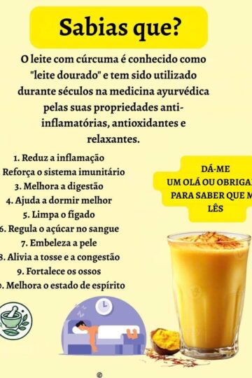 Leite Dourado com Cúrcuma: Descubra os 6 Principais Benefícios desta Bebida Milenar O leite com cúrcuma, popularmente chamado de golden milk ou “leite dourado”, é uma bebida ancestral originária da medicina ayurveda. Preparado com cúrcuma fresca ou em pó e leite aquecido, frequentemente recebe ingredientes complementares como pimenta-do-reino, mel ou canela para potencializar suas propriedades. […]
