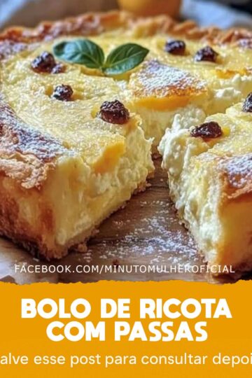 Bolo de Ricota com Passas Ingredientes: 1 xícara de ricota amassada 1 xícara de açúcar 3 ovos 1/2 xícara de óleo 1 xícara de leite 2 xícaras de farinha de trigo 1 colher de sopa de fermento em pó 1/2 xícara de passas 1 colher de chá de essência de baunilha Modo de Preparo: Primeiramente, […]